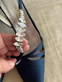 Scarpa modello chanel in raso di seta colore blu, con fascetta trasversale con swarovski, tacco 8 cm.