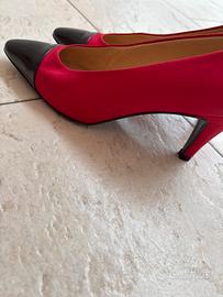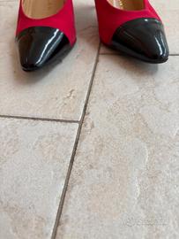 Vendo scarpa Prada, modello décolleté, con punta in vernice nera e pelle ricoperta di tessuto rosso. Tacco 8cm e n. 35.5, condizioni molto buone.