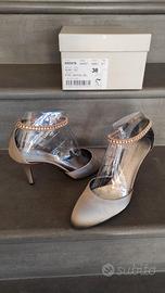 Scarpa sandalo gioiello Giorgio Armani in seta color écru/oro. Mis 38, tacco 8 cm, cinturino con strass, scatola originale. Indossati una sola volta, vedi foto: sono praticamente nuovi.