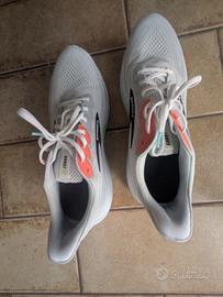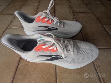 Le Brooks ghost 16 sono scarpe da running neutre con ammortizzazione DNA LOFT v3 infusa di azoto per una corsa morbida e reattiva. La tomaia engineered mesh garantisce traspirabilità e supporto mirato, ideali per allenamenti quotidiani e lunghe distanze, ma adatte anche per un uso quotidiano. Il modello è del 2024 ma, come si può vedere dall'etichetta, questo specifico paio è stato prodotto nel febbraio 2025. Colore: principalmente bianco, con piccoli dettagli arancioni e blu. Comprate nel marzo 2026 in saldo a 120€ con prezzo originale di 150€. Rivendo perchè purtroppo mi sono accorto a posteriori di aver preso una taglia troppo grande per me, ma avendo perso lo scontrino non posso fare il cambio in negozio. Indossate letteralmente un paio d'ore solo sul tapis roulant. Quindi sono praticamente nuove.