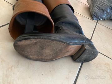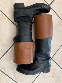 Stivali inglesi replica stile 1700/1800 da caccia alla volpe o da palazzo ottimi per rievocazione storica . La taglia è 41 a tubo per gambe/polpaccio Slim in quanto imbocco veste stretto . Il colore è nero e marrone scuro la fascia alta . Stivali fatti a mano in vera pelle cucito a mano e molto morbidi e cuoio ,niente gomma niente di preconfezionato . Usati una volta causa vestibilita' stretta al polpaccio mai più indossati. Astenersi perditempo prezzo non trattabile spedizione a parte a scelta. Spedizione dopo 3 gg a pagamento avvenuto .