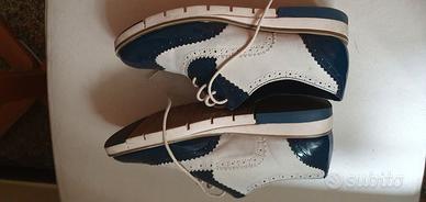 Scarpa stringata bicolore bianco blu pelle e vernice, numero 39, marca Bata. Pubblicato anche su altri portali