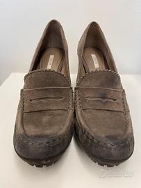Scarpa col tacco Geox Respira, pelle scamosciata, numero 39. Gli effetti sulla punta e sul retro sono propri del pellame. Tacco comodo.