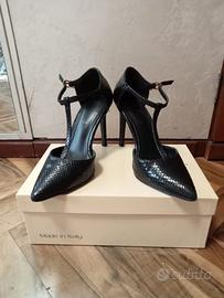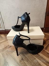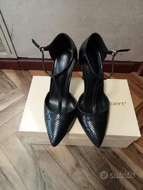Scarpe tacco 10 cm nere con laccetto alla caviglia, vera pelle, Made in Italy, usata una sola volta, pelle stampata effetto pitone. Estremamente eleganti. Misura 36. Richiesta Euro 50,00.