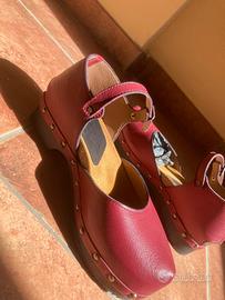Scarpa bordeaux n.39, tomaia similpelle, laccetto regolabile, dettagli borchiette color oro, comode e stabili sul piede, gomma antiscivolo. Indossate due o tre volte, senza scatola.