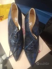 Vendo scarpe eleganti in pelle, taglia 37, mai usate, colore blu pitonate., con lacci, tacco 8 cm