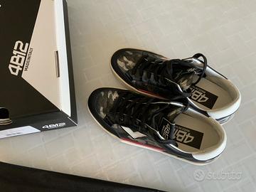 scarpe 4B12 sneakers basse, nuove e originali, complete di scatola e sacca, esterno pelle, interno in pelle, soletta interna rialzata, colore nero/mimetico con baffi fucsia, chiusura con lacci, punta tonda, suola in gomma. Per info contattatemi