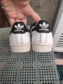Iconiche scarpe Adidas Superstar II con punta arrotondata e texture a conchiglia (Shell toe). Tomaia in pelle biaahe liscia con le classiche tre strisce nere seghettate Stringhe nere piatte non originali Per zona Aulla, La Spezia consegna a mano senza spese