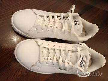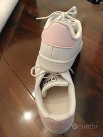 Scarpe Adidas a pianta larga, con lacci. colore bianco. Particolare rosa sul retro. Misura 38 1/2. Praticamente nuove