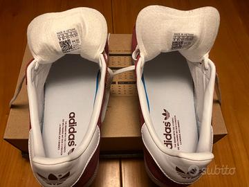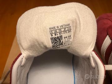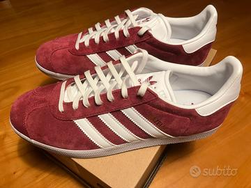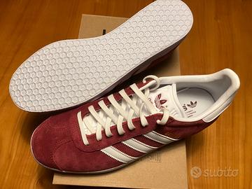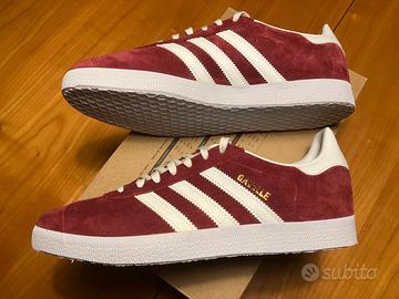 Vendo scarpe Adidas Gazelle, colore collegiate burgundy/cloud white. Originali, nuove, mai utilizzate. Taglia 42 2/3 (26.3 cm) Vestibilità standard, chiusura con lacci, tomaia in suede, suola in gomma, fodera in materiale sintetico. Manca scatola originale.