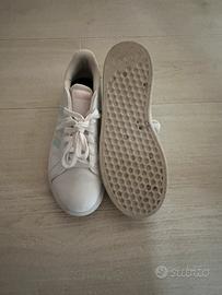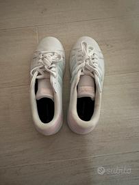 Scarpe da ginnastica Adidas modello Grand Court Base 2.0. - Design classico con le iconiche tre strisce. - Dettagli in rosa sulla linguetta e sul tallone. - Tomaia bianca in similpelle.