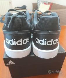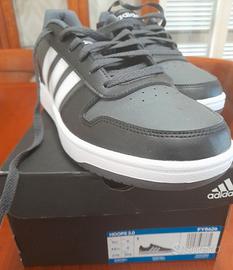 Scarpe ADIDAS HOOPS 2.0 (identiche alle 3.0 e 4.0), misura 43 1/3, AUTENTICHE, suolla in gomma bianca ultracomoda, tomaia nera a strisce logo come in foto, NUOVE IN SCATOLA;