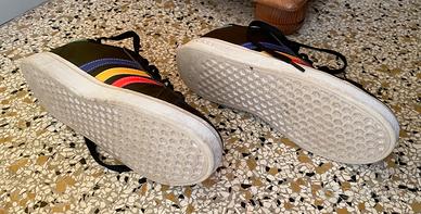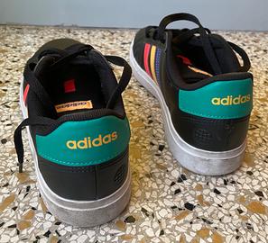 Scarpe sportive Adidas nere con dettagli colorati. Taglia 39 1/3, US 6,5, UK 6, JPN 250, CHN 240. - Strisce laterali multicolore (blu, giallo, rosso, verde). - Logo Adidas sulla linguetta.