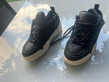 Le scarpe sono in pelle nera con suola bianca.