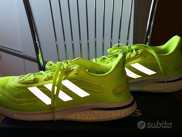 Scarpe Running Adidas Supernova tg. 46 2/3 nuove al 100% garantito, mai usate, mai indossate, con cartellino attaccato e scatola originale, in tela giallo fluo, strisce laterali Adidas riflettenti, soletta removibile, CONTROLLARE BENE LA LUNGHEZZA DELLA SOLETTA PERCHÉ CALZANO STRETTO!