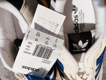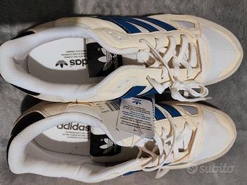 Vendo scarpe Adidas ZX750 NUOVE con scatola originale taglia 12,5 uk. in Italia corrisponde ad un 46 o 46,5. scarpe nuove in quanto mai messe, mai calzate da mio figlio il quale preferiva un altro modello e l'ha comprate da solo. Scarpe bianche con tre righe blu e tacco giallo.