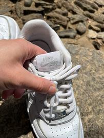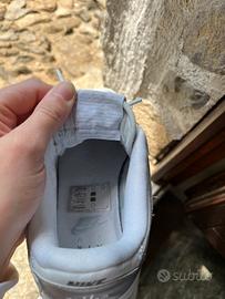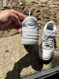 Scarpe Nike air force one, bianche e argento, edizione limitata con dettaglio doppia scritta laterale e posteriore, nessun difetto, numero 36, molto comode e rialzate da terra, spugna interna molto morbida, colore perfettamente bianco, acquistate in negozio a 170€, prezzo trattabile