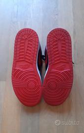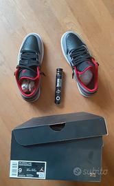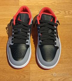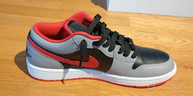 Scarpe Air Jordan 1 low. Taglia EUR 42,5 - US 9 - UK 8 - cm 27 - BR 40,5. Colore black (nero), fire red (rosso) e cement grey (grigio). Con lacci neri originali impermeabili. Nuove, mai utilizzate per regalo sbagliato. Compreso secondo paio di lacci neri corti dell'apposita misura per non essere allacciati (ora nelle scarpe).