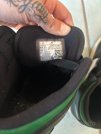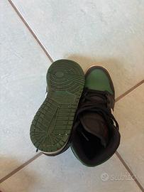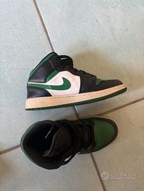 Nike Air Jordan 1 Mid bianco/nero/verde in buone condizioni. Scarpe originali, usate ma ben tenute, con normali segni di utilizzo (visibili soprattutto sulla suola). Modello iconico e molto versatile, facile da abbinare sia a outfit sportivi che casual. Tomaia in pelle con dettagli verdi e logo Nike laterale.