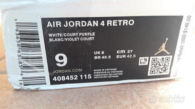 Vendo scarpe da ginnastica - jogging / trekking - AIR JORDAN modello 4 Retro (n° art. 408452 115), unisex numero europeo 42,5 più vicino al 42 che al 43, completamente nuove e mai portate in quanto troppo piccole per il mio piede 43.
