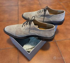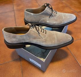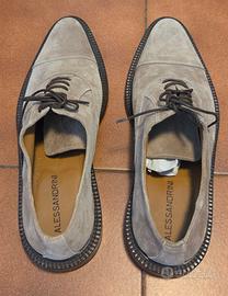 Vendo splendide scarpe eleganti Alessandrini, realizzate in un raffinato camoscio color grigio chiaro/beige (Colore 18 - K52) con suola in cuoio e rifiniture scure. La taglia è un 42.