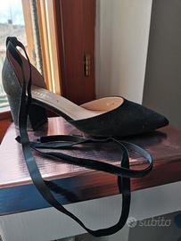 Scarpe nere, con nastro di velluto da girare intorno alla caviglia, tacco cm 6, brillantinate, indossate una sola volta!!