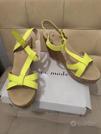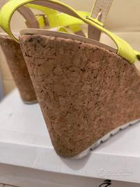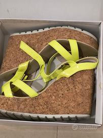 Come da titolo belle scarpe con suola zeppa alta in sughero, fibbie regolabili, lavorazione intrecciata colore giallo/verde lime fluo.
