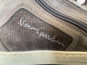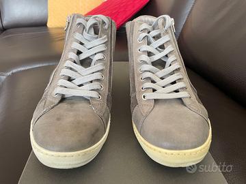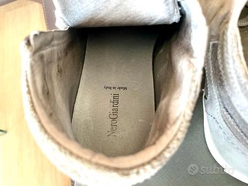 Scarpe alte con doppia chiusura (stringhe e cerniera laterale). Marca: Nero Giardini. Taglia: 41. Colore: grigio con suola chiara. Materiali: tomaia in tessuto foderato e suola in gomma. Pochissimo usate, in buone condizioni. La tomaia presenta delle leggere macchie (vedi foto), ma nessun danno. La suola presenta, sulla superficie inferiore, un leggero annerimento dovuto all’uso delle scarpe, anche se molto limitato.