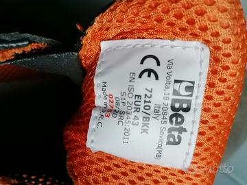 Scarpa antinfortunistica Beta articolo 7210 BKK scamosciata traforata grigia numero 43 con puntale in materiale polimerico, resistenza 200 joule anti perforazione. Nell' ultima foto dell' annuncio c'è la scheda tecnica della scarpa.
