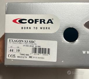 Vendesi scarpe antinfortunistiche Cofra modello Exagon S3 SRC, numero 44, colore nero / giallo. Calzatura bassa in tessuto TECHSHELL innovativo, molto tenace, idrorepellente e