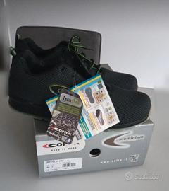 Scarpe da uomo con punta in acciaio, mai indossate, scatola originale etichetta originale. Colore nero e profili verde alta visibilità.