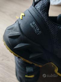Calzatura di sicurezza bassa S3S idrorepellente in tessuto tecnico poliestere. Supporto ergonomico del tallone e protezione della punta in TPU. Puntale in alluminio 200J. Inserto antiperforazione K-SOLE. Calzata 11. Tecnologia di ammortizzazione Stable Impact System. Fodera in Air Mesh con antiscalzante in microfibra. Plantare anatomico microforato, antistatico estraibile in PU espanso riciclato a celle aperte, traspirante con carboni attivi. ESD.