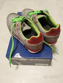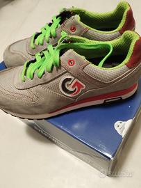 Colore grigio con dettagli rossi e fucsia e lacci verde fluo, numero 39. Comode per essere antinfortunistiche, hanno suola Michelin.
