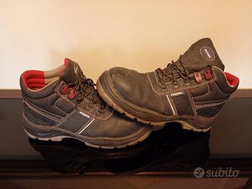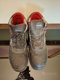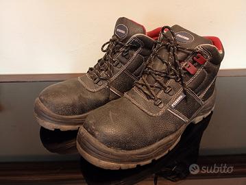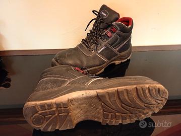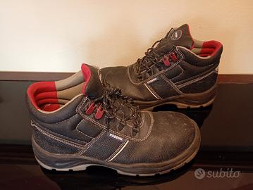 Scarpe antinfortunistiche alte, ideali per lavori che richiedono protezione. - Tomaia in pelle nera resistente. - Fodera interna rossa e grigia. - Suola robusta. - Chiusura con lacci neri e rossi.