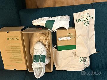 Sneakers Valentino Garavani modello “Open” colore bianco con fascia verde, complete di scatola originale, dust bag e lacci extra.