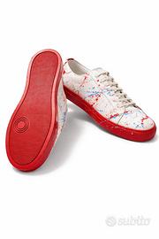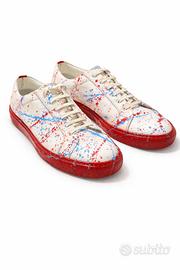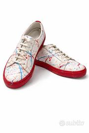 Proponiamo un paio di calzature uniche, interamente realizzate a mano da maestri artigiani. Questo modello si distingue per l'iconica lavorazione con schizzi di vernice multicolore su base neutra, rendendo ogni pezzo un'opera d'arte irripetibile.