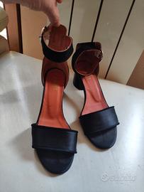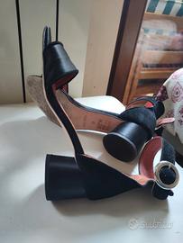 Vendo scarpe vera pelle, camoscio e raso nero, aperte davanti. Molto eleganti, con tacco 3 cm. Molto ben rifinite, ottima qualità, poco usate. Suole senza segni di consumo.