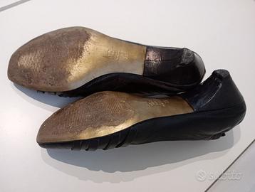 Ballerine marca Ixos con tacco 4 cm in vero cuoi made in Italy, modello Baleno nero con motivo a intreccio sulla punta, complete di sacchettino originale per il trasporto. In ottimo stato. Prezzo originale 215€. Pagate 59€ all'outlet.