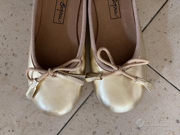 Scarpe ballerine da donna con fiocchetto e nappine, a punta tonda, pelle laminata color platino morbidissima. Tomaia, soletta e fodera in vera pelle, suola in vero cuoio zigrinata e antiscivolo, marca Sotto Sopra, lavorazione artigianale toscana, made in Italy, n. 36. Nuove con scatola.
