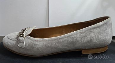Ballerine nr.37 in suede color grigio chiaro e catena argentata decorativa. Originali Pollini acquistate in outlet a 150euro. Indossate pochissime volte, come nuove, ancora nella scatola originale. Vera pelle e suola in vero cuoio. Made in Italy.
