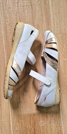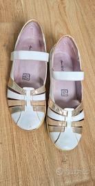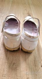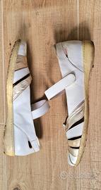 Scarpe ballerine bianche e dorate, modello Mary Jane con fibbia a chiusura a strappo (velcro). Misura 40, tomaia e soletta in vera pelle e fondo in gomma. Usate, sono presenti segni di uso in diversi punti, vedi foto.