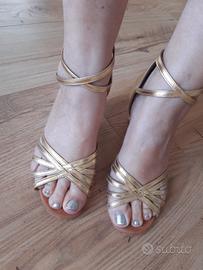 scarpe da ballo, colore oro, con morbida suola interna in camoscio e suola esterna in camoscio. Tacco 7 cm. Misura 39. Con sacca x trasporto. qualche segno di usura