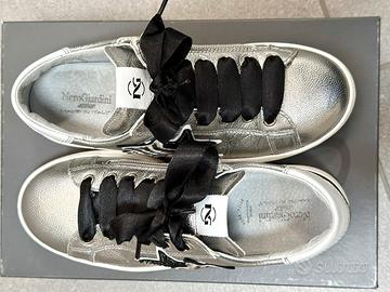 Vendo questo sfizioso paio di scarpe sneakers Nero Giardini in vera pelle colore argento per bambina.