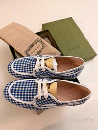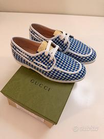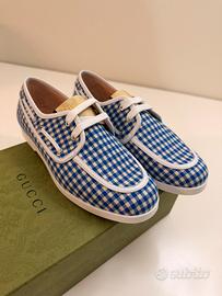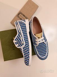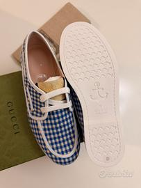 Eleganti e originalissime scarpe Gucci per bambino, con fantasia a quadretti blu e bianchi (stile gingham), perfette per un look estivo chic e raffinato. Taglia 33