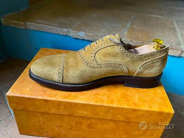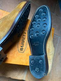 Belle scarpe Barrett scamosciate color tabacco, fodera in vitello suola di gomma Dainite. Usate solo due volte e in condizioni eccellenti come da documentazione fotografica. Misura UK 9 43 italiano. Vengono vendute con scatola originale e busta per conservarle. Atre foto su richiesta. Le forme in legno non sono comprese.