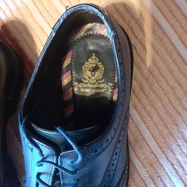 Francesine BASE LONDON in pelle blu con suola in gomma. La taglia è il 40, la suola misura 24 cm, la tomaia 29 cm. Usate un paio di volte, tenute molte bene Non ci sono macchie e la pelle non presenta cattivi odori, solo qualche piccolo segno di usura anche se indossate veramente poco