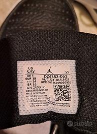 Scarpe da basket Nike Air Jordan nere con dettagli rossi. Usate pochissimo per misura errata. Un graffio nell'occhiello rosso della scarpa destra.