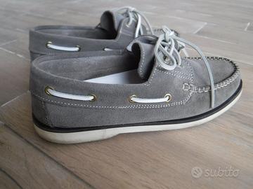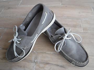 Scarpe mocassino basso in tessuto scamosciato resistente colore grigio con stringhe bianche in pelle e suola gommata tipo barca misura 42 come in foto. Taglia: 42 (EU) oppure 8 (UK).
