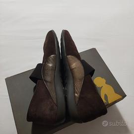Scarpe donna Benvado in camoscio marrone, con inserti laterali in pelle color bronzo.