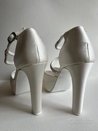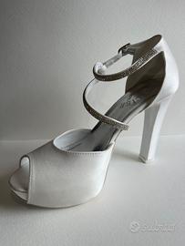 Vendo scarpe artigianali raso bianco seta con strass, numero 39, tacco 11, scatola originale. Scarpe indossate solo una volta.
